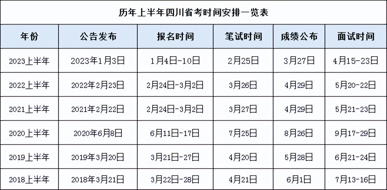 参考近几年考试时间,除了2020年因新冠疫情影响推迟至7月份启动,其它年份考试时间一直比较稳定,而且每年都参加多省公务员联考。由此推测:2024年四川公务员考试预计会在2024年2-3月份启动,具体时间以官方发布的公告为准。
