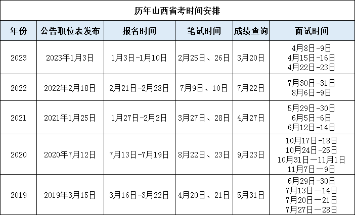 除了2020年因疫情原因推迟至7、8月份举行,其他年份山西公务员考试时间比较稳定,报名集中在2-3月份。且近几年多次参加了公务员联考,笔试时间与联考时间一致。2024年山西公务员考试公告预计会在明年2-3月左右发布,参加多省公务员联考。
