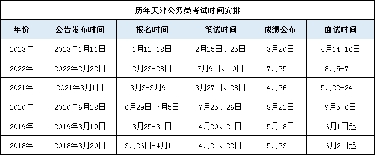 从以上表格来看,近几年天津市考都参加了多省公务员联考。如果2024年天津市考继续参加联考,公告职位表预计会在2023年1-2月份发布。2-3月份笔试。准确时间还要以2024年天津市考公告为准。