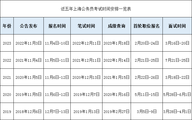 参考上表,预计2024年上海公务员考试公告和职位表在2023年11月初发布,最晚不会超过12月中旬。(具体请以最新公告为准)