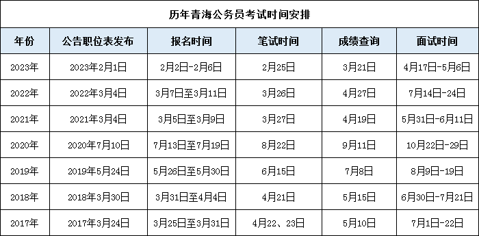 从以上表格来看,除了2019年因机构改革,青海省考推迟没有参加联考。其它年份青海省考均参加了联考;如果2024年青海省考继续参加联考,公告职位表预计会在2023年2月份发布。准确时间还要以2024年青海省考公告为准。