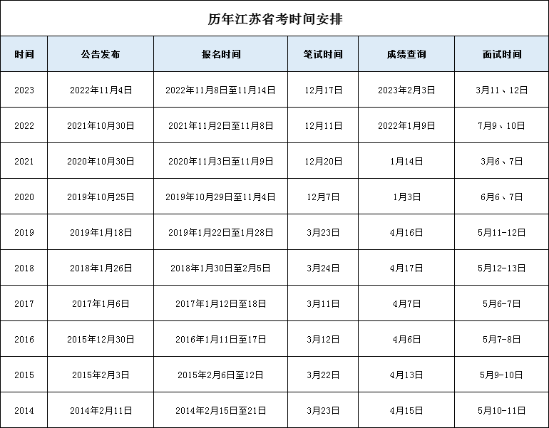 根据上表,我们可以发现:2014?2019年江苏公务员考试时间还算稳定,而2020?2023年江苏省考与往年相比,报名考试时间提前约3个月!