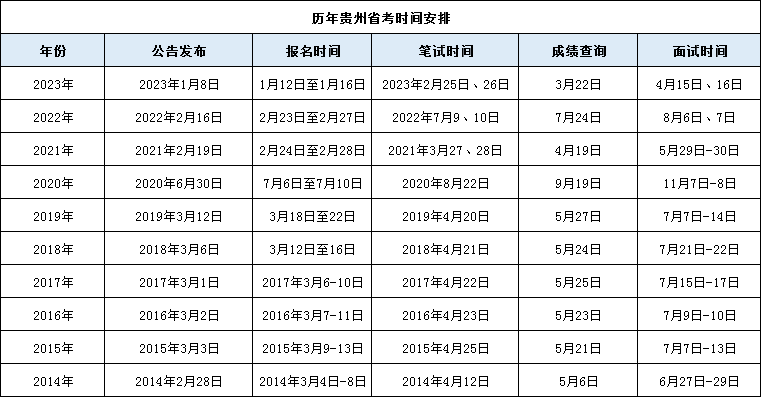 从以上表格来看,近几年贵州省考都参加了多省公务员联考。如果2024年贵州省考继续参加联考,公告职位表预计会在2023年1-2月份发布。2-3月份笔试。准确时间还要以2024年贵州省考公告为准。