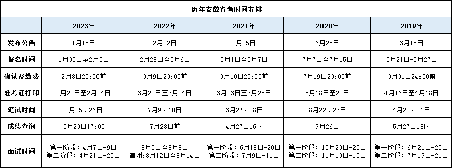 除了2020年因疫情原因推迟至7、8月份举行,其他年份安徽公务员考试时间比较稳定,报名集中在2-3月份。且近几年多次参加了公务员联考,笔试时间与联考时间一致。2024年安徽公务员考试公告预计会在明年2-3月左右发布,参加多省公务员联考。