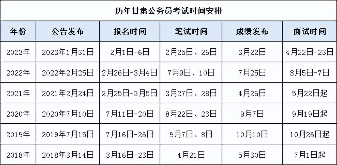 以下为近几年甘肃公务员考试时间节点安排,供参考。