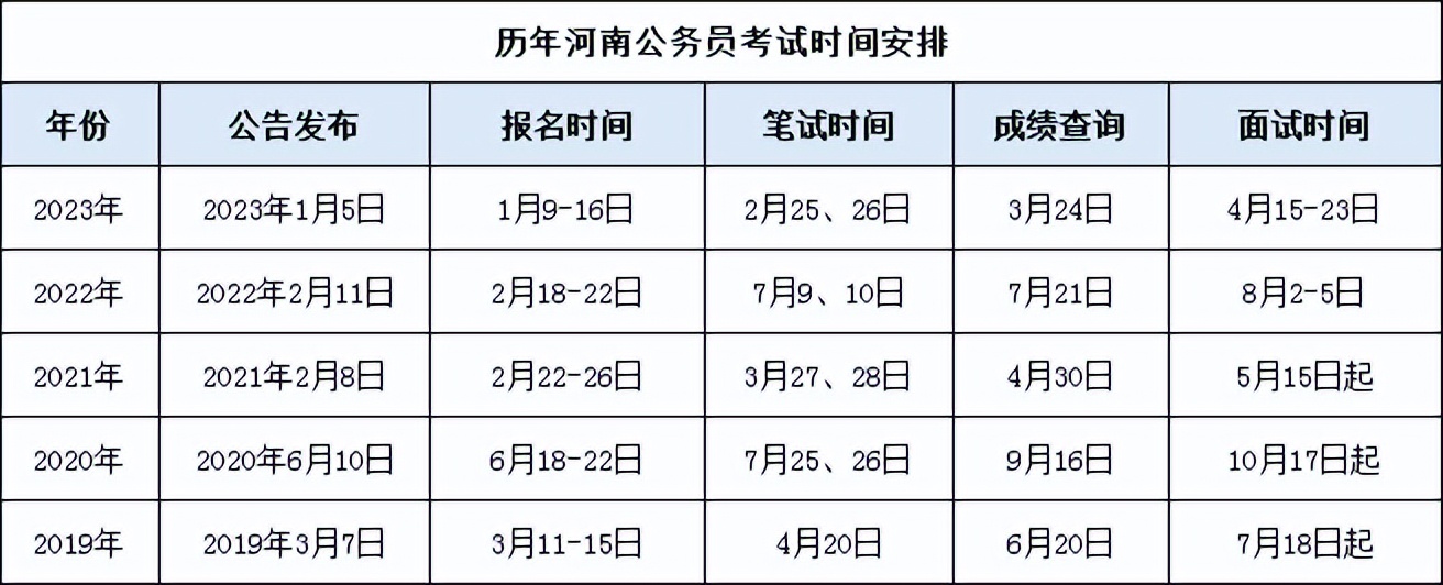 从以上表格来看,近几年河南省考都参加了多省。如果2024年河南省考继续参加联考,公告职位表预计会在2024年1-2月份发布,2-3月份笔试。准确时间还要以2024年河南省考公告为准。