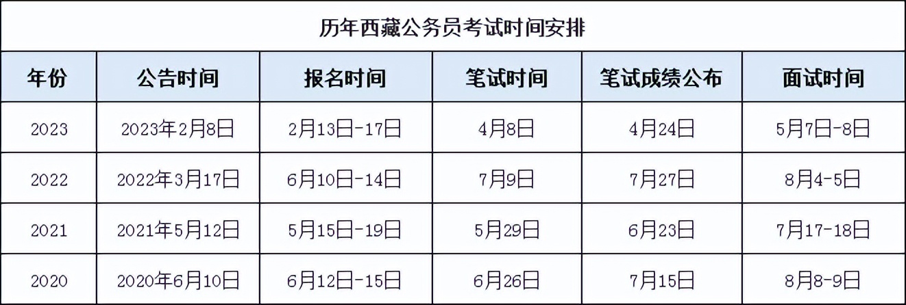 从以上表格来看,近几年西藏公务员考试都是单独招录,启动时间差距较大,预计24年何时启动还有待继续关注。