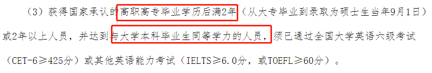 专科毕业满2年或2年以上人员,并达到与大学本科毕业生同等学力的人员,须已通过全国大学英语六级考试(CET-6≥425分)或其他英语能力考试(IELTS≥6.0分,或TOEFL≥60分)。