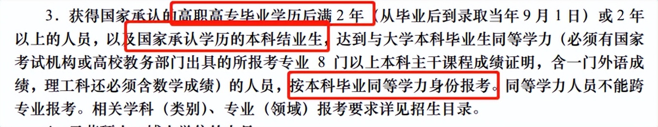 专科毕业满2年或2年以上的人员,达到与大学本科毕业生同等学力的人员,报考时须以第一作者在国家核心期刊上发表一篇以上与所学专业相关的学术论文;若取得复试资格,复试时需提交进修学校提供的学习证明及成绩单,另需加试三门与报考研究生专业所对应或相近的本科专业主干课程。