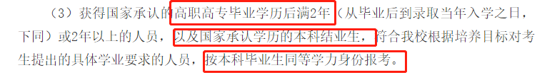 专科毕业满2年或2年以上的,以及国家承认学历的本科结业生,符合我校对考生提出的具体学业要求的人员,按本科毕业生同等学力身份报考。