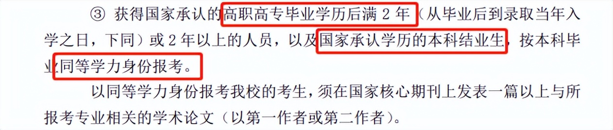 以同等学力身份报考我校的考生,须在国家核心期刊上发表一篇以上与所报考专业相关的学术论文(以第一作者或第二作者)。