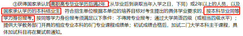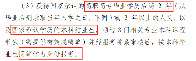 专科毕业满 2 年或 2 年以上的人员,以及国家承认学历的本科结业生,通过8 门相关专业本科课程考试(需提供有效成绩单)并经报考院系审核后,按本科毕业生同等学力身份报考。
