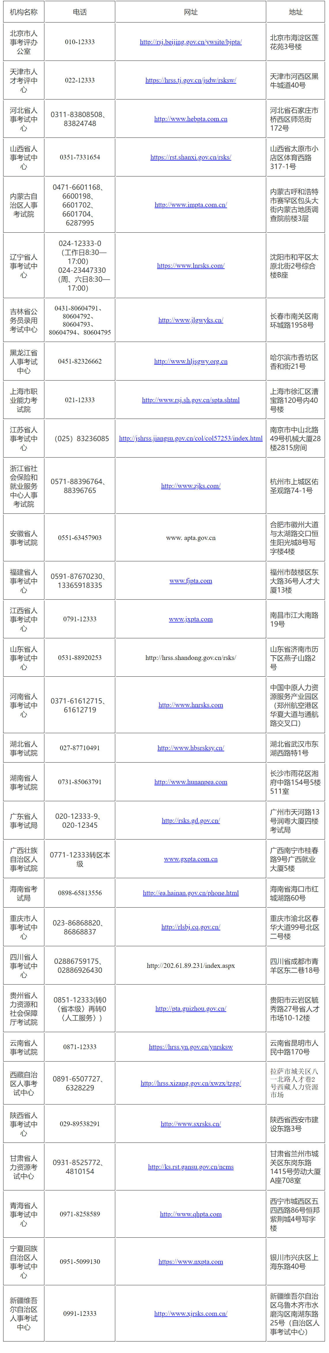 各省(区、市)人事考试机构咨询电话和联系地址