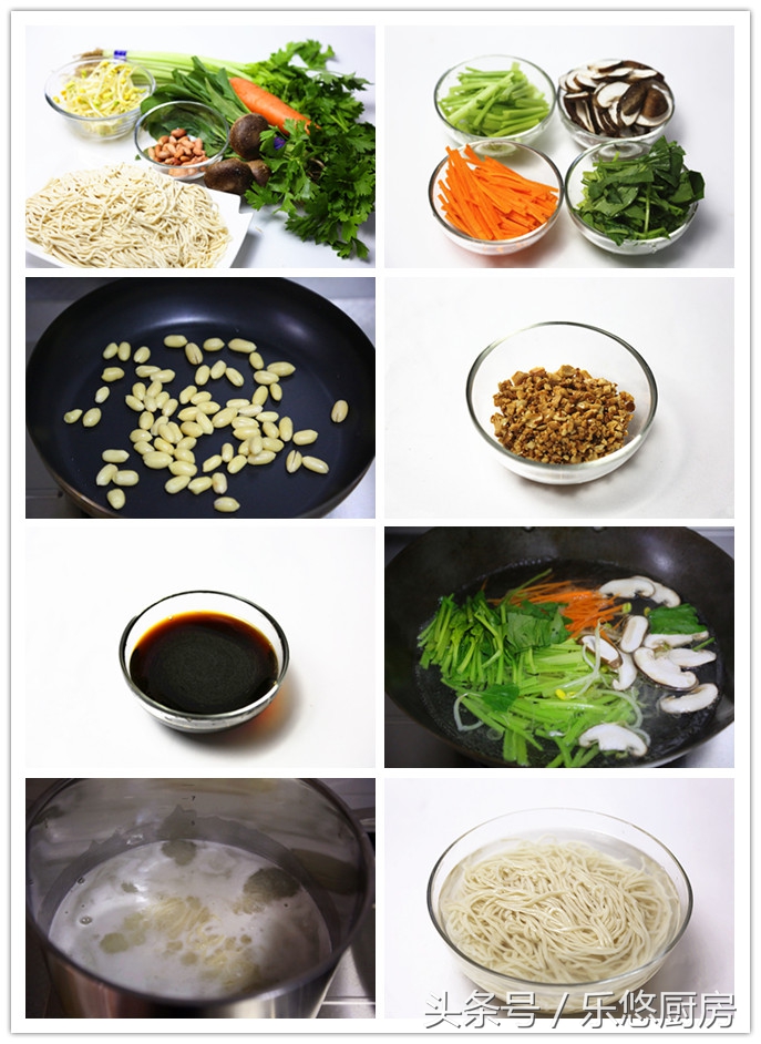 第一步:准备食材。面条500克、芹菜200克、香菇几个、黄豆芽100克、胡萝卜1根、菠菜1小把、香菜适量、香葱适量、熟白芝麻适量、花生米适量。(蔬菜可以按自己的喜好来)
