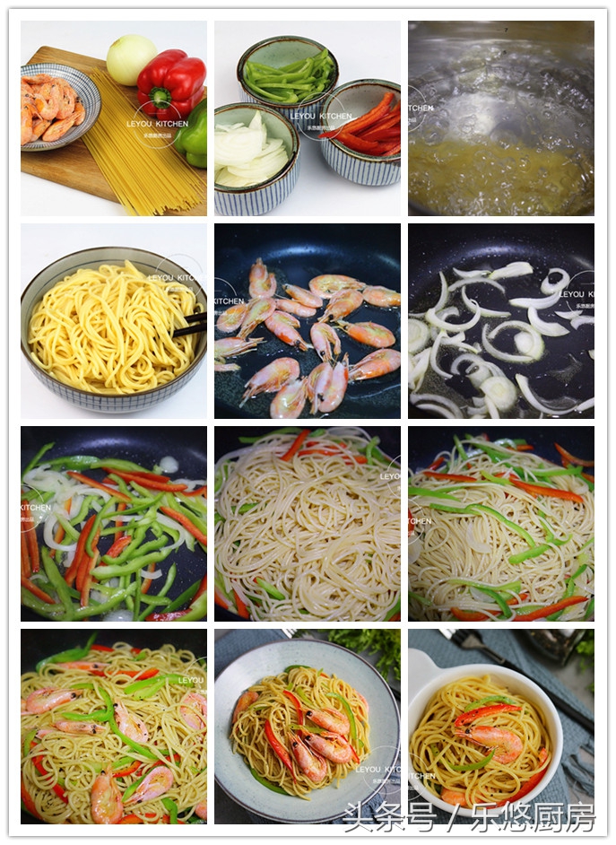 第一步:准备食材。意大利面200克、北极虾适量、青椒1个、彩椒半个、洋葱半个。