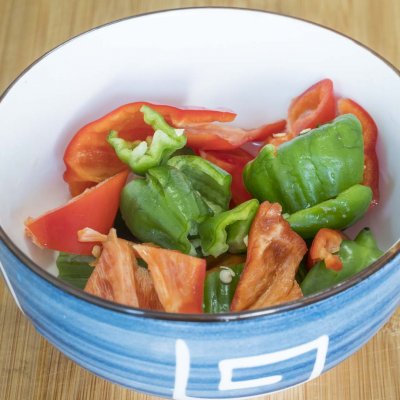 5、配菜我还准备了一个红辣椒和2个青辣椒,洗净后去籽切滚刀块,切好后也先装起来;