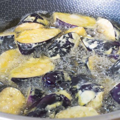 小贴士1、切好的茄子加一勺盐后再加清水,用水泡着可以防止氧化变黑; 2、炸茄子,全程大火,这样茄子才不会吸油;