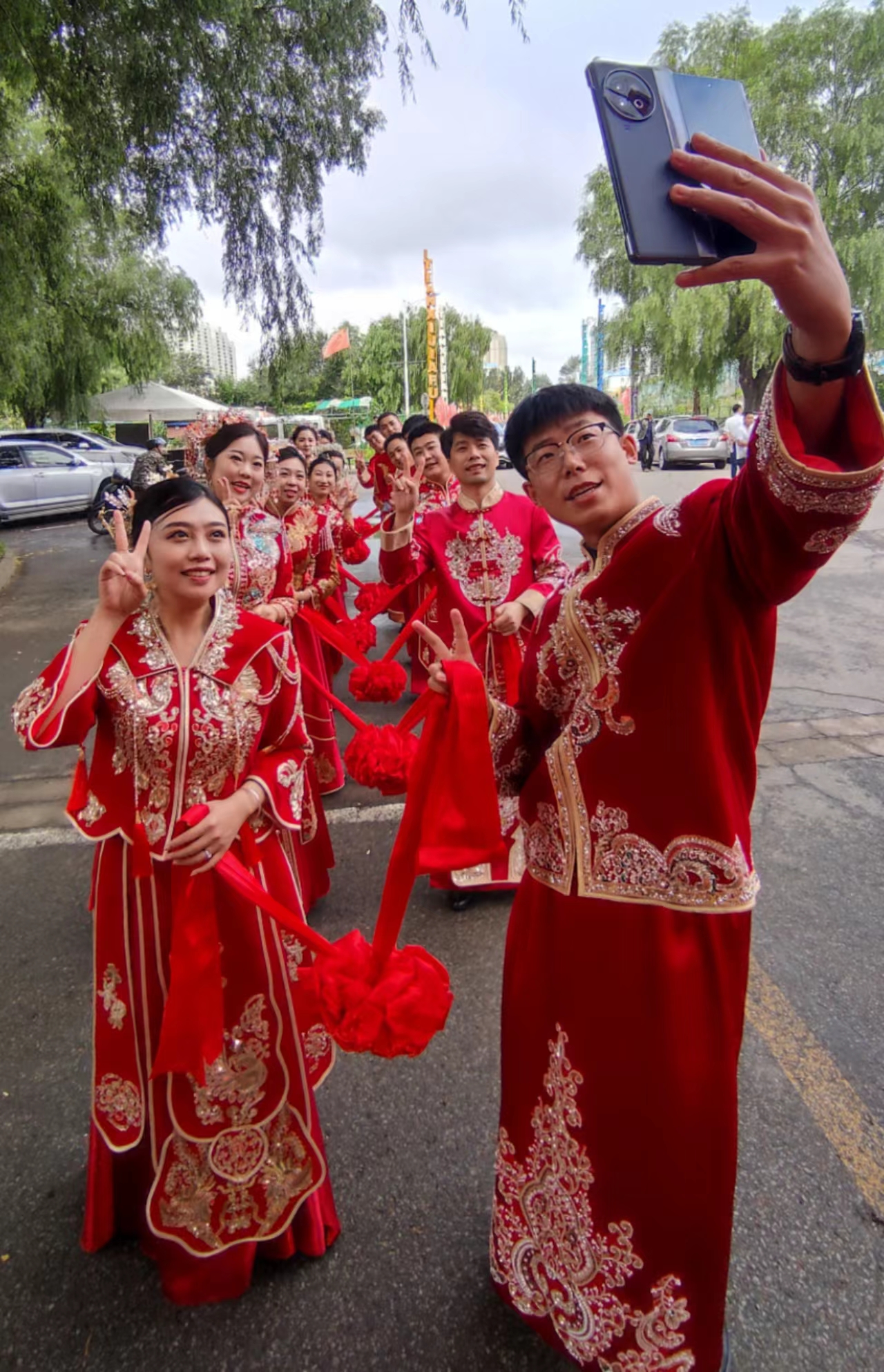 一张张喜悦的笑脸,一阵阵欢快的掌声,一对对新人收下现场内外亲朋好友、公司职工的真诚祝福,纷纷拍下精彩纷呈的画面、引人入胜的抖音、活灵活现的短视频,把婚礼的喜庆气氛推向了高潮。