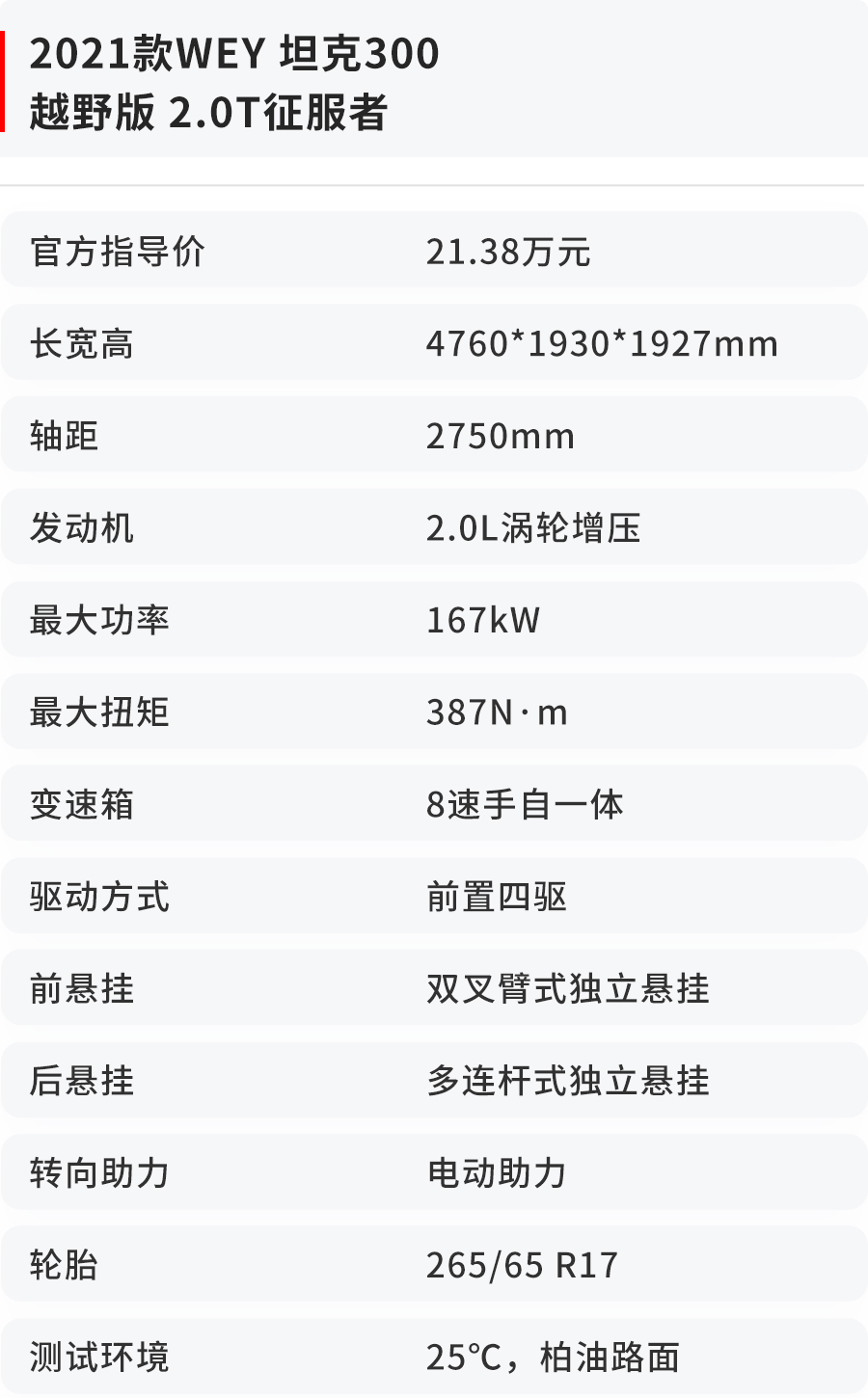 值得一提的是,虽然刹车力度做得很线性,不过力来得总不是很强,踏板行程短而硬,紧急刹车时还是缺少点信心。从我们的实测数据也验证了这一点,坦克300因为悬挂调教较软,在急刹时点头比较明显,最终百公里刹车距离为43.98米,成绩并不理想。而9.85s的百公里加速成绩虽然不算快,但在城市里代步通勤也绝对够用了,毕竟这也不是硬核越野车的强项。