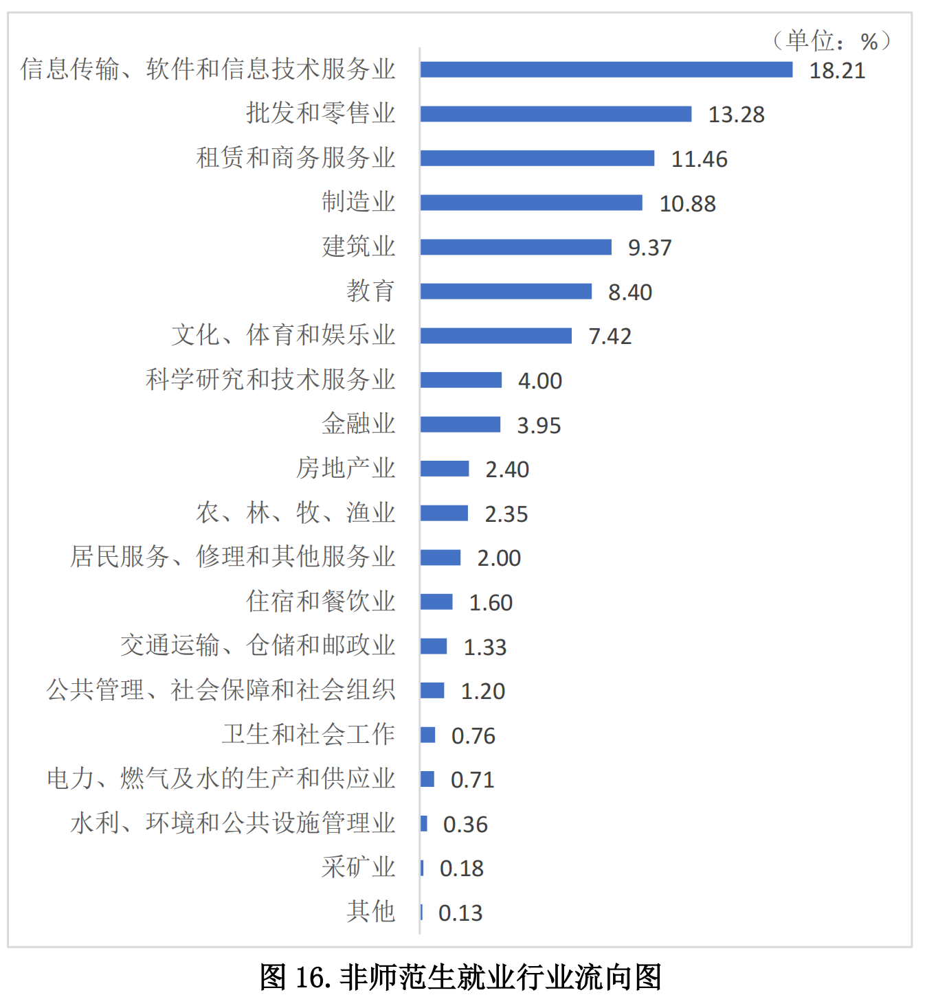 从 山东管理学院2021 届非师范生的就业行业流向看,就业人数最多的 4 个行业分别为信息传输、软件和信息技术服务业(18.21%)、批发和零售业(13.28%)、租赁和商务服务业(11.46%)、制造业(10.88%)。