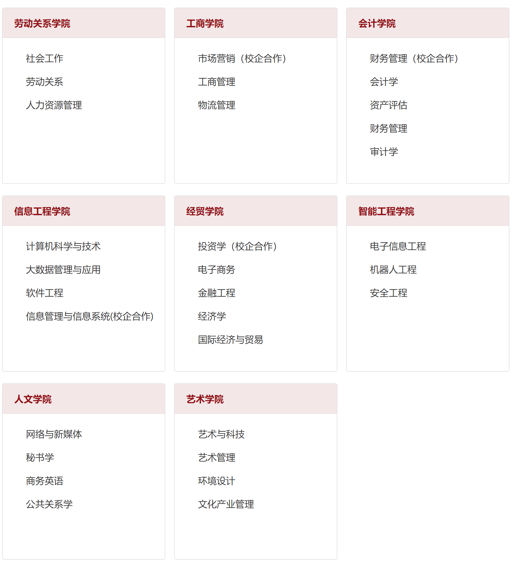 根据山东管理学院2020—2021学年本科教学质量报告,该校现有本科专业 30 个,涵盖 6 个学科门类:其中管理学专业 12 个,占比 40.00%;工 学专业 5 个,占比 16.67%;经济学专业 5 个,占比 16.67%;文学专业 3 个,占 比 10.00%;艺术学专业 4 个,占比 13.33%;法学专业 1 个,占比 3.33%。形成 了以管为主,管、经、工、文、艺、法等学科协调发展的专业布局。