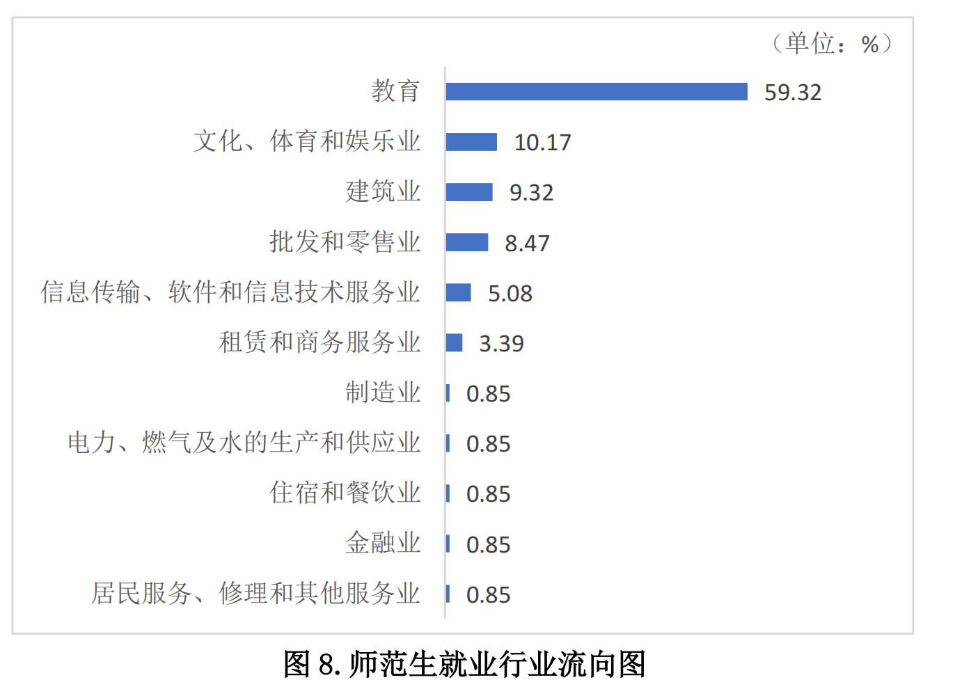 师范生就业单位性质流向显示,企业就业人数最多,其中,非国有企业占 49.15%,国有企业占 0.85%;事业单位占 27.97%,其他(包括部队、基层项目、城镇社区、农村建制村等)占 22.03%。其中,就业人数最多的行业为教育行业 (59.32%)。