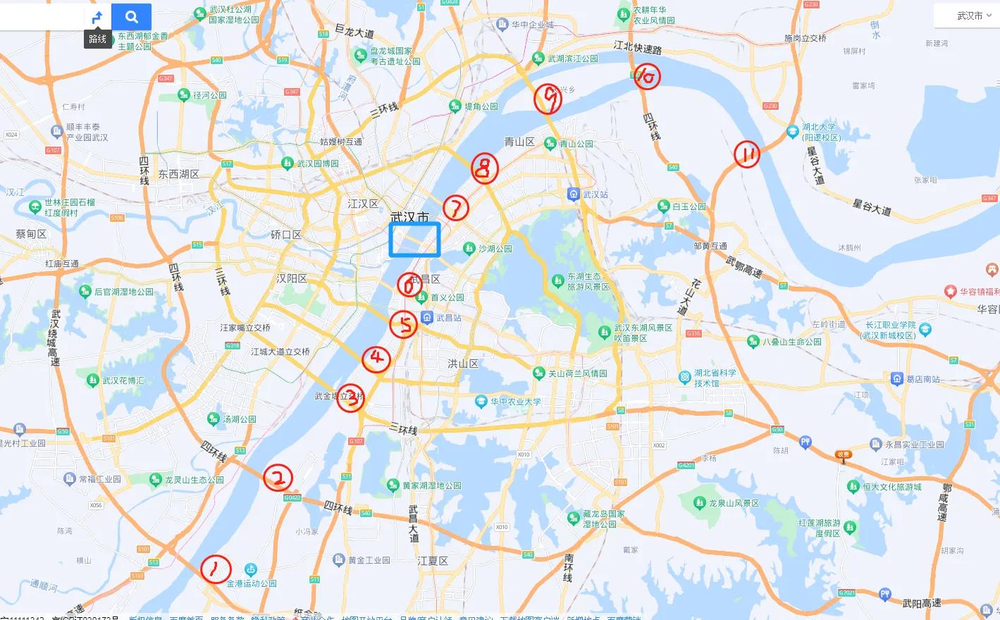 图中蓝色框内的是武汉长江隧道。除了武汉长江隧道外,还有地铁2号线、4号线、7号线(长江公铁隧道)、8号线等过江通道。