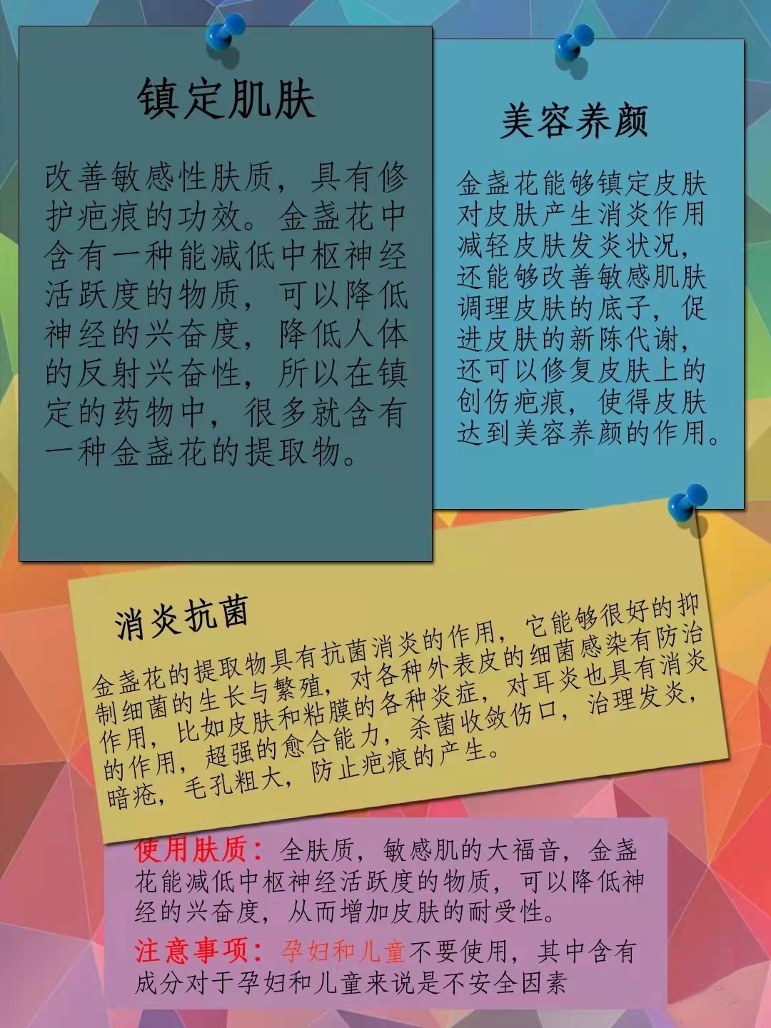 此外夏天贴面膜或者护肤品中有金盏花成分的,也有一定的消炎以及舒缓镇静的功效。因此,敏感皮肤或者晒后修复都可以挑选含有金盏花的护肤产品以及面膜