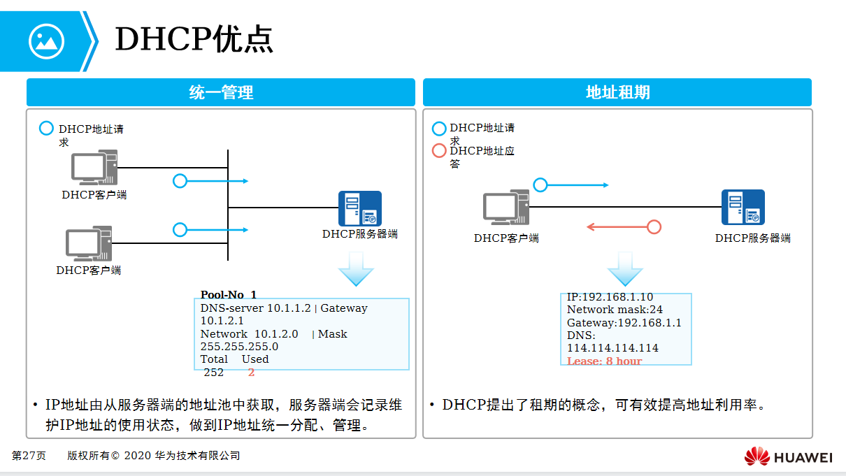 DHCP是动态主机配置协议,是为解决传统的静态手工配置方式的不足应运而生的一种技术,可以实现网络动态合理地分配IP地址给主机使用。