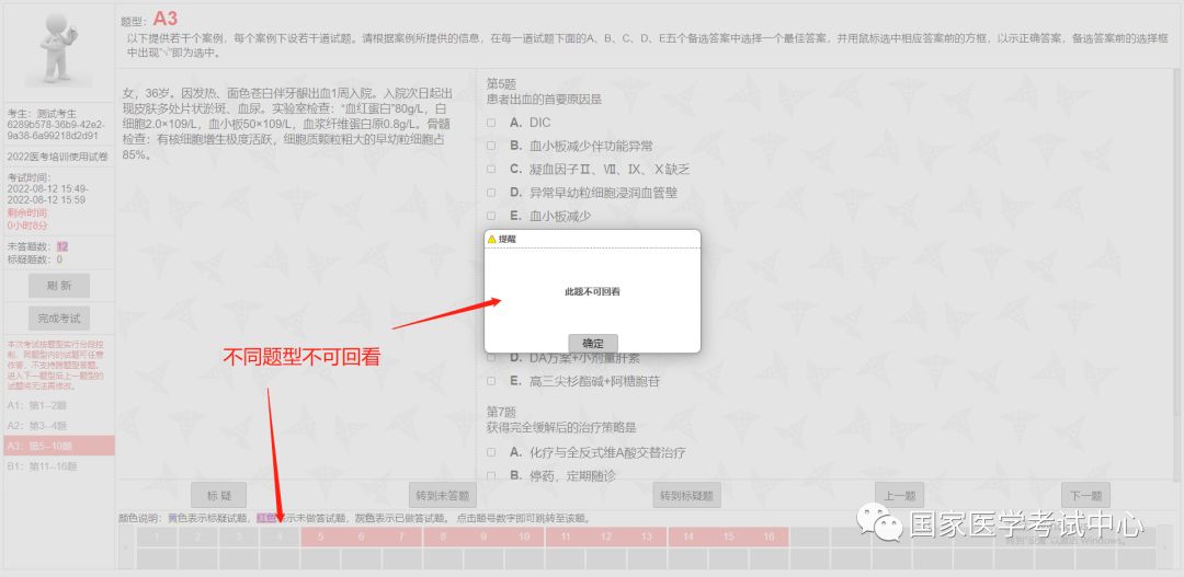 03跨提型不可回看医师资格考试综合考试试卷包括A1 、A2、A3/A4和B1四种题型。为加强考试管理,维护考试公平,计算机化考试“跨题型不可回看”,考生须完成同一题型内全部试题作答后,方可进入下一题型。